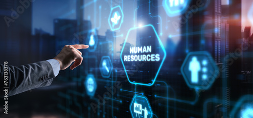 Human Resources HR management Recruitment Concept. Businessman clicks icon
