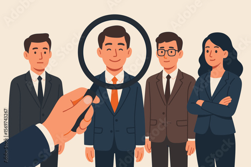 Human resources recruitment concept, selecting outstanding candidate, job interview, hiring process, employment choice, business team, magnifying glass, HR decision, new employee