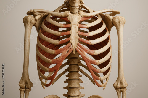 Human rib cage anatomy with highlighted intercostal muscle structure showing medical healthcare skeletal system for educational study