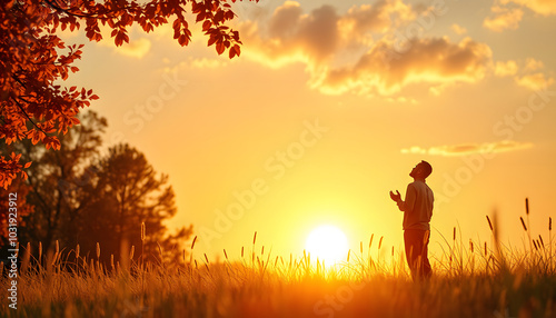 Human Rights Day concept: Silhouette of human standing to worship God in meadow autumn sunset background isolated with white highlights, png