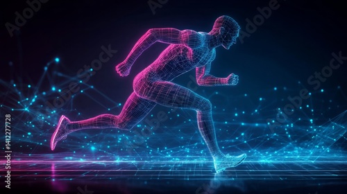 Human running man athlete with digital wireframe neon light background