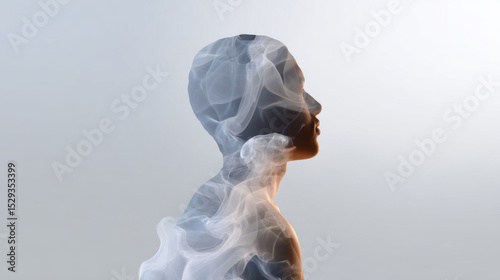 Human silhouette filled with swirling smoke creates abstract and ethereal concept against soft gradient background. image evokes sense of mystery and introspection