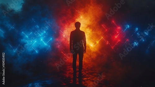Human silhouette standing top of arrows pointing outward various directions representing decisionmaking goal orientation and leveraging market opportunities for success