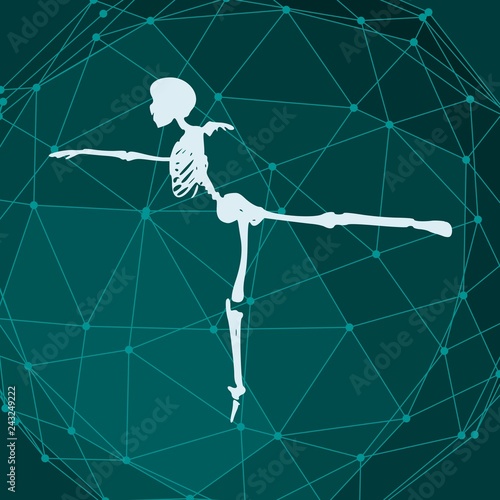 Human skeleton posing. Dancing pose. Halloween party design template. Molecule and communication background. Connected lines with dots.