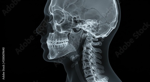 Human Skull and Neck X-Ray - Detailed x-ray showcasing the human skull and cervical spine in profile view against a black background