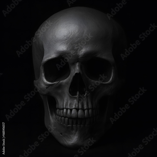 Human skull dark background, anatomy bone structure close up, skeletal head detail, death horror symbol, medical science study, gothic art concept, halloween decoration macabre design, mortality abstr