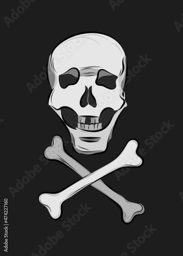 human skull with bones on black background. doodle