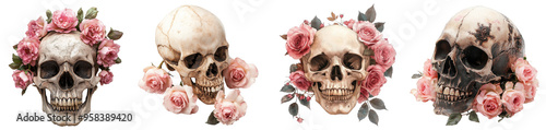 Human skulls decorated with orange marigold flowers, festive Dia de los Muertos art, transparent background