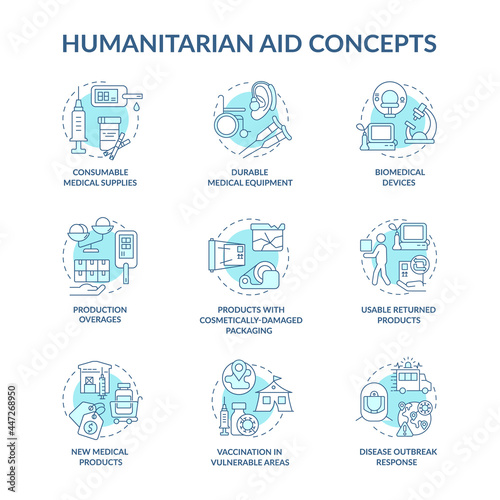 Humanitarian aid review concept icons set. Disease outbreak response and consumble medical supplies idea thin line color illustrations. Vector isolated outline drawings. Editable stroke