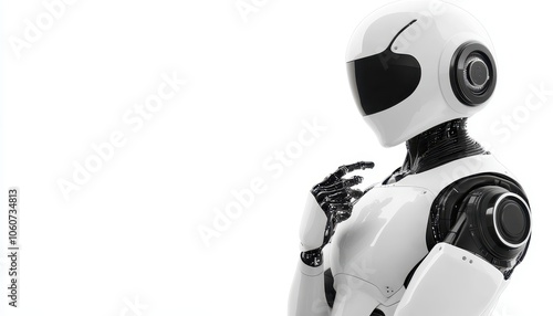 Humanoid robot in thought-provoking pose against a minimalist white background