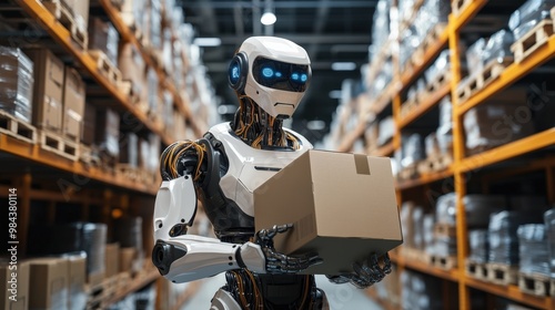 Humanoid robot working in a futuristic warehouse carrying boxes