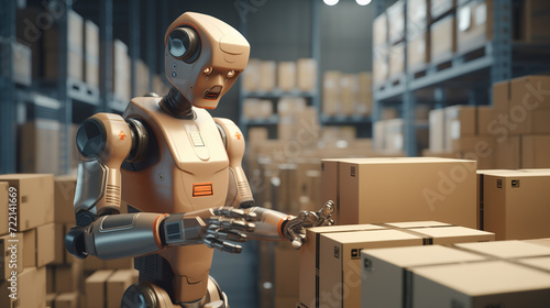 humanoid robot working in a shipping company arranging cardboard boxes, artificial intelligence replacing humans concept photo