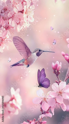 Hummingbird and Butterfly in Blossom - Spring Serenity