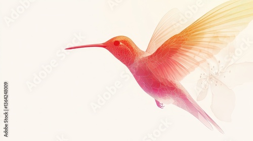 Hummingbird Flight with Spring Flowers, Artistic, and Nature.