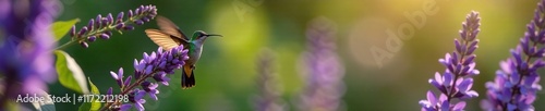 Hummingbird hawk moth hovering around purple flower clusters, garden, flowers