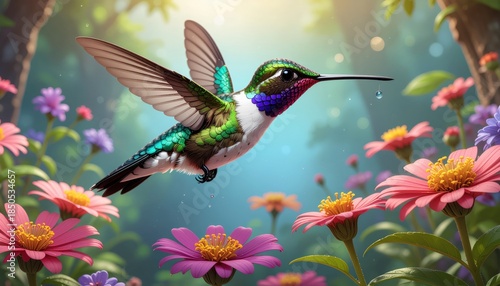 Hummingbird Hovering Amidst Vibrant Flowers in Lush Forest