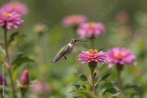 Hummingbird hovering near blooming flower in sunlit garden