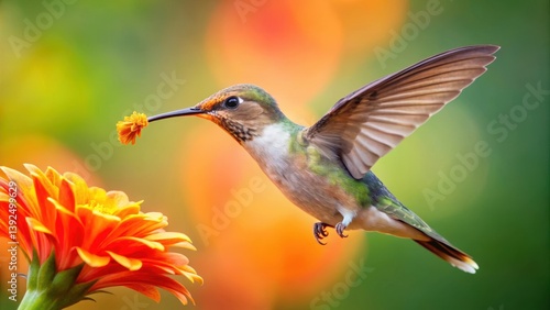 Hummingbird in mid-air, wings beat rapidly as it sips nectar from a bright orange flower with delicate pink petals