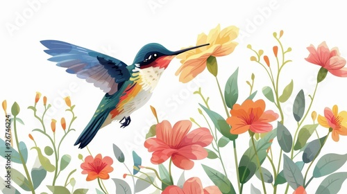 Hummingbird sipping nectar from flowers, flat design, isolated on white background