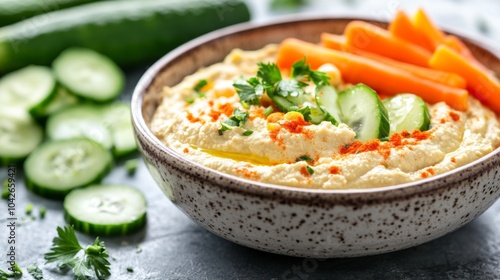 Hummus with Cucumber, Carrot, and Parsley in a Bowl