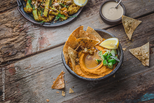 Hummus with olive oil and flat bread, copy space