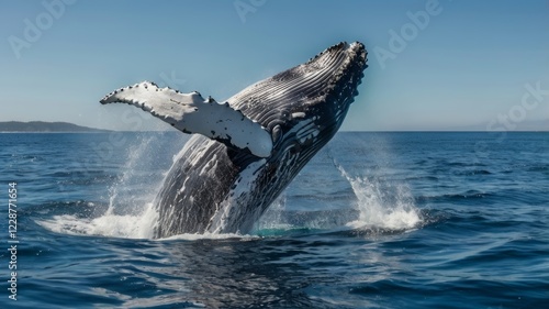 Humpback whale breaching in the vast blue ocean under a clear sky, showcasing its immense size