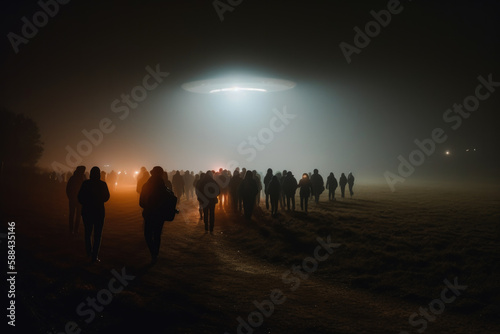 Hundreds of people walking towards a large UFO in the mist, late night time. High quality generative ai