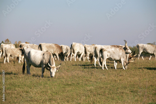 Hungarian gray cattle cows with calves grazing on pasture summer