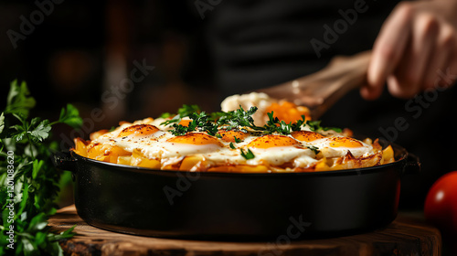 Hungarian Rakott Krumpli layered potato casserole, served with smoked sausage and eggs in a rustic kitchen, [Eastern European comfort food, family meals]