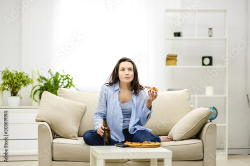 Hungry woman chews, holding a bottle of beer and a slice of pizza hands. Isolated woman on blurred light background. Copy space.