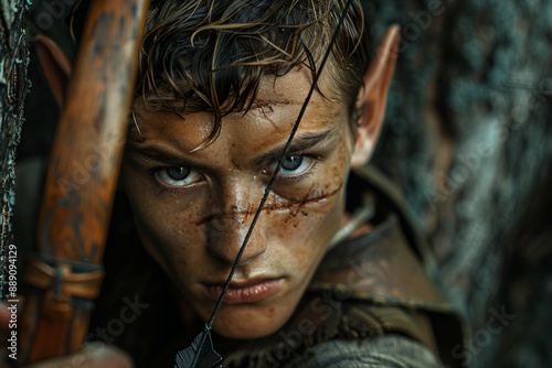 Hunter male female shooting from rifle gun in woods safari hunting season, Generative AI