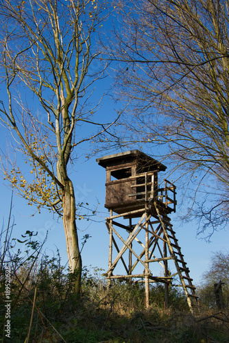 Hunting tower on the edge of the forest. Hunting lookout between the trees.