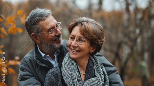 Husband and wife in 50s hugging each other outdoor Caucasian male female with spectacles glasses in woods forest
