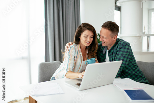 Husband and wife preparing bills to pay. Young couple having financial problems...