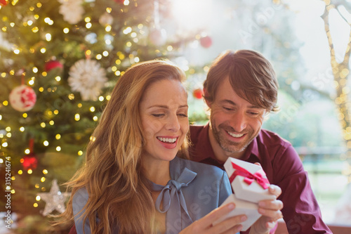 Husband watching wife opening Christmas gift in front of Christmas tree