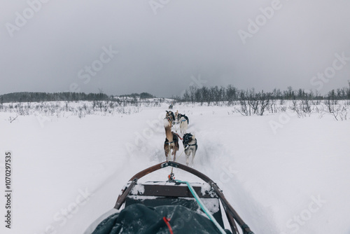 Huskies dogs towing a sled in the snow in northern Norway, winter landscape
