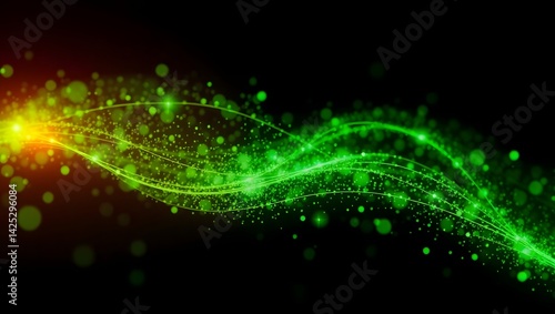 Hybrid green-gold abstract wave glowing with energy particles and fluid motion