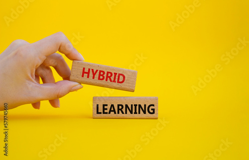 Hybrid learning symbol. Concept word Hybrid learning on wooden blocks. Businessman hand. Beautiful yellow background. Business and Hybrid learning concept. Copy space