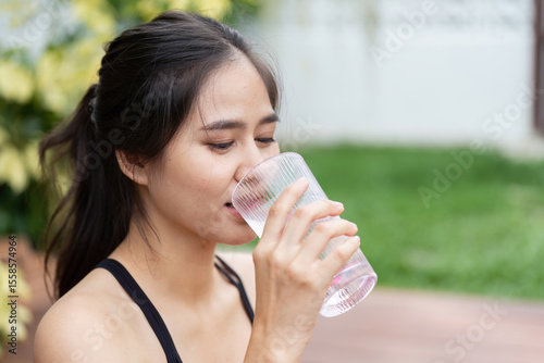 Hydration and Wellness. A woman sipping water in a garden setting.