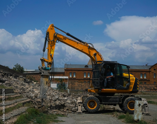 Hydraulic breaker hammer excavator at demolition work. yellow crusher excavator stands sideways on ruins of building against backdrop of rural landscape and blue sky Crushing concrete structures