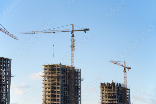 Hydraulic luffing jib tower cranes and workers being poured concrete into foundation. Cement pouring into formwork of building at construction site. Tower cranes constructing a new residential build