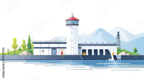 Hydroelectric Dam Power Plant with Control Tower and Mountain Landscape.