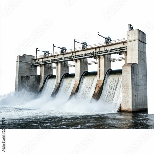 hydroelectric dam with cascading water flow, industrial structure, powerful current, renewable energy source, engineering marvel, water management system.