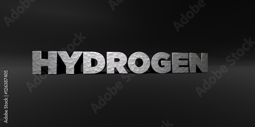 HYDROGEN - hammered metal finish text on black studio - 3D rendered royalty free stock photo. This image can be used for an online website banner ad or a print postcard.