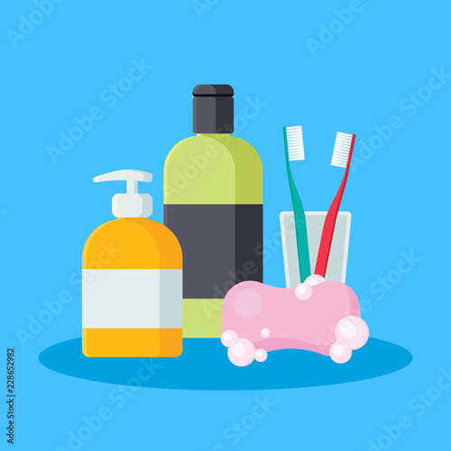 Hygiene and beauty products Set vector illustration in modern flat style. Collection of soap, shampoo, Toothbrush and liquid soap in bottle flat icons isolated on blue background.