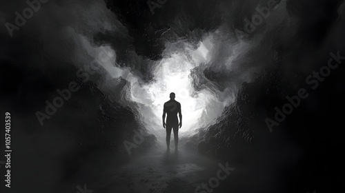 Hyper detailed 3D depicting a solitary pallid humanoid silhouette standing resolute at the heart of a unified dark mass their posture and bearing exuding an aura of absolute authority and command