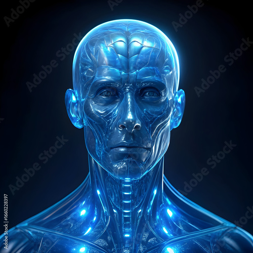 Hyper realistic 3D render of human head with transparent blue glass skin revealing skull, brain and anatomy, cinematic moody lighting on dark background, jpg file"