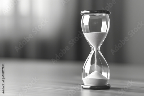 Hyper realistic hourglass as time passing concept for business deadline urgency, showcasing the sand flowing through the glass, warm black and white retro style