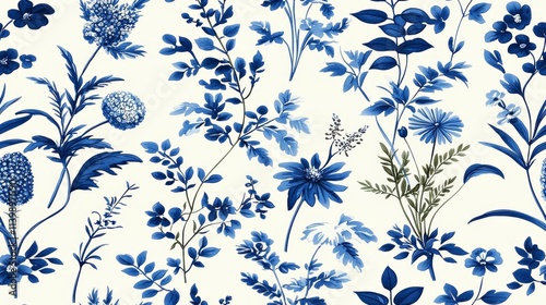 hyper realistic photo of A vibrant blue and white floral pattern featuring various plants, creating an elegant and aesthetically pleasing design