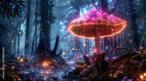 Hyperdetailed dark shot of a luminous mushroom in a forest, surrounded by neon lights and drops, backlit